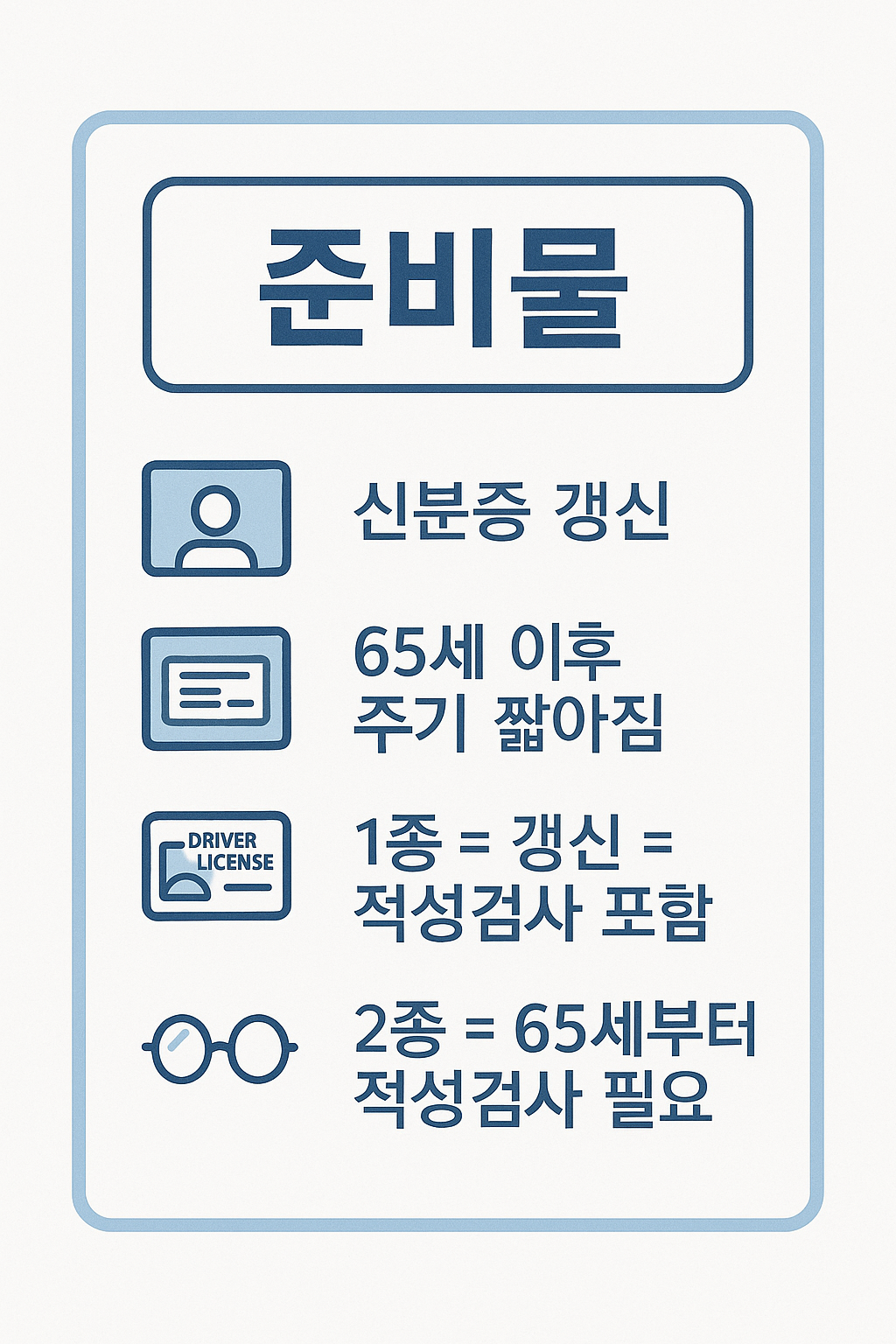 • 핵심: **적성검사**는 시력, 청력 등 신체 능력이 운전에 적합한지 확인하는 검사가 **필수**로 포함됩니다. **1종 적성검사 시기**는 만료일 전 1년 이내에 해야 합니다.