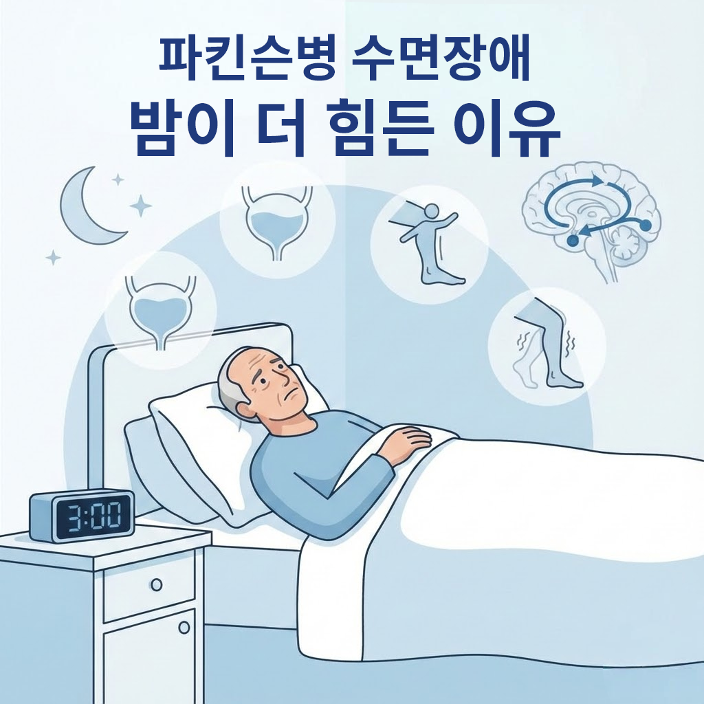 파킨슨병 진단을 받기 전에는 잠 문제를 크게 의식하지 않는 사람이 많다. 낮에 손 떨림이나 몸이 굳는 느낌이 먼저 걱정이고, 잠은 그냥 요즘 좀 뒤척인다 정도로만 생각한다. 그런데 이상한 건, 낮에는 나쁘지 않던 몸이 밤만 되면 갑자기 말을 안 듣는다는 거다. 누우면 다리가 가만히 있지를 못하고, 꿈이 너무 선명해서 깨버리고, 화장실도 자주 간다. 이런 변화가 며칠 반복되면 잠이 무섭다라는 말까지 나온다.